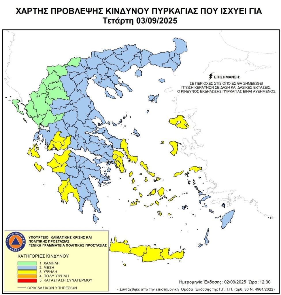 Υψηλός κίνδυνος πυρκαγιάς (κατηγορία κινδύνου 3) προβλέπεται σήμερα Τετάρτη σε κάποιες περιοχές της χώρας, σύμφωνα με το Χάρτη Πρόβλεψης Κινδύνου Πυρκαγιάς που εκδίδει η γενική γραμματεία Πολιτικής Προστασίας του υπουργείου Κλιματικής Κρίσης & Πολιτικής Προστασίας (civilprotection.gov.gr).